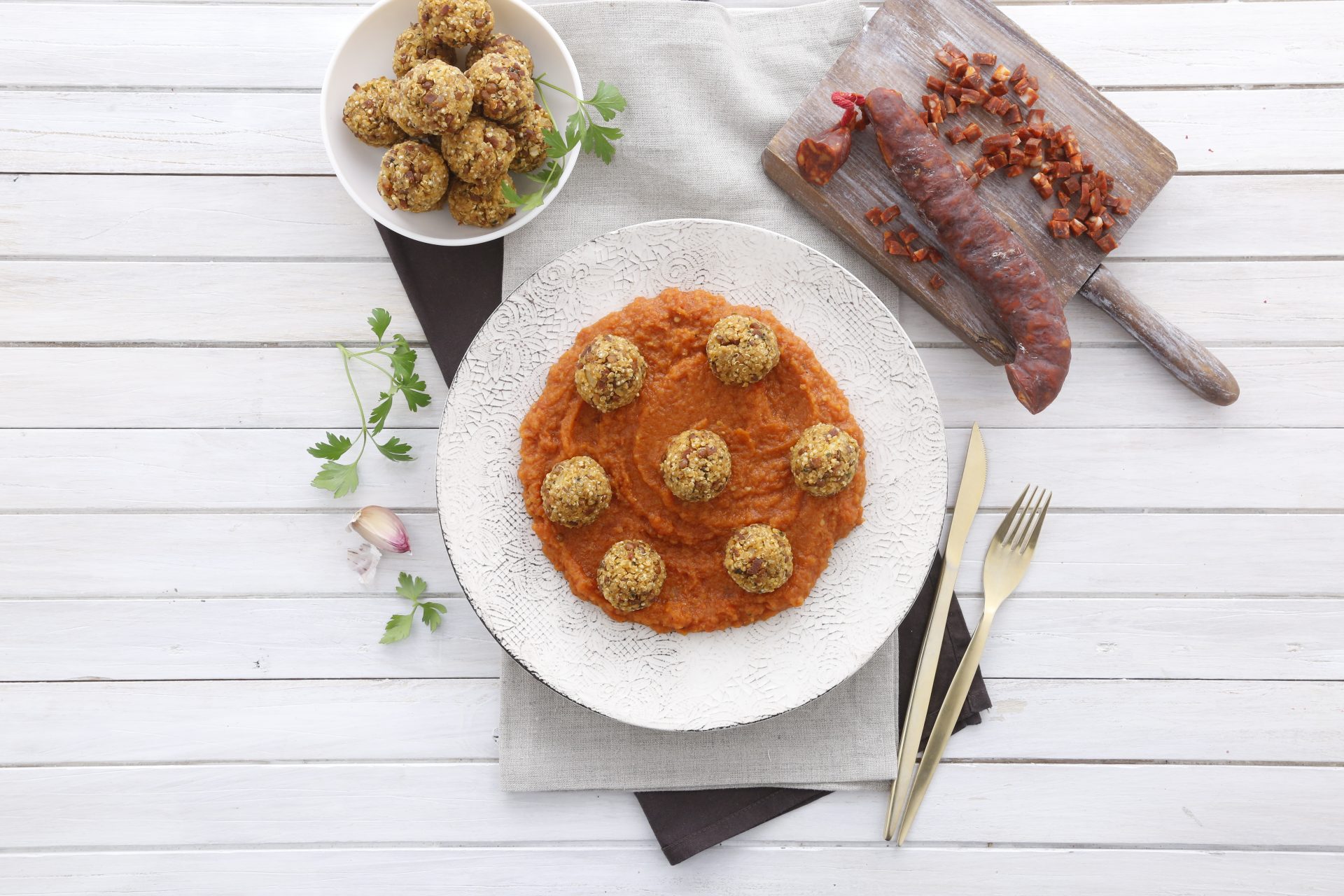 En nuestro caso, hemos optado por una versión que aúna tradición y modernidad: estas deliciosas albóndigas de quinoa con IGP Chorizo Riojano.