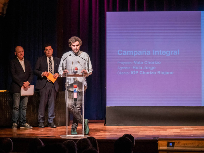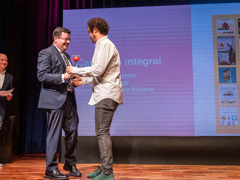 Jorge Martínez, responsable creativo de la agencia Hola Jorge, subió a recoger el galardón como empresa responsable de la campaña, y que fue entregado por Alfonso Dominguez, Consejero de hacienda, gobernanza pública y sociedad digital del Gobierno de La Rioja.